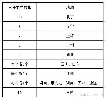 在地域分布上,88位現任主任委員中有近四成(33位)來自北京的單位,實力雄厚的遼寧、上海和北京相比,也被甩出好幾十條街,可見帝都的霸氣。