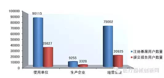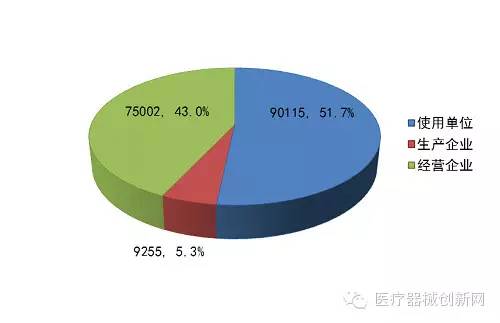 截止2014年12月31日,在全國醫療器械不良事件監測系統中,注冊基層用戶(包括生產企業、經營企業和使用單位)共174,372家。其中,醫療器械生產企業9,255家,占注冊基層用戶總數的5.3%;經營企業75,002家,占注冊基層用戶的43.0%;使用單位90,115家,占注冊基層用戶的51.7%(圖1-4)。