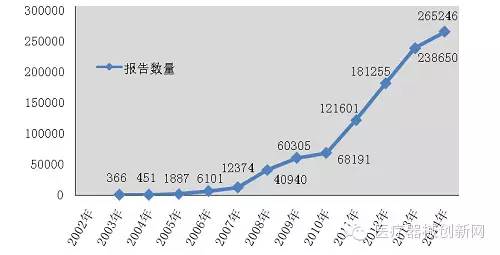 圖1-5 2002-2014年全國可疑醫療器械不良事件報告數量