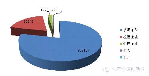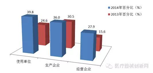 總體來看,器械不良事件報告仍主要來源于器械的使用單位。相比2013年,生產企業提交報告所占比例有所下降,與其器械使用安全第一責任人的地位不符,其履行職責的自覺性有待提高。此外,經營企業報告所占百分比也下降了3.1個百分點。