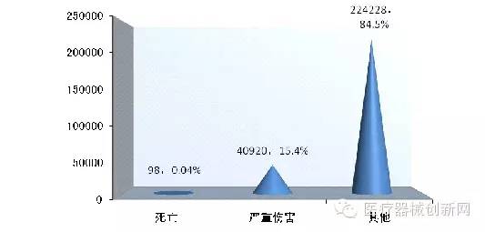 2014年可疑醫療器械不良事件報告中,事件傷害為死亡的報告共98份,占總報告數的0.04%;事件為嚴重傷害的報告共40,920份,占總報告數的15.4%;事件傷害為其他的報告共224,228份,占總報告數的84.5%(圖2-4)。