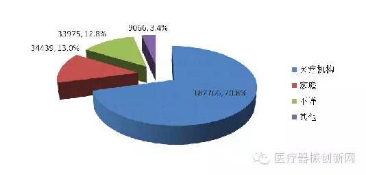 2014年可疑醫療器械不良事件報告中,使用場所為“醫療機構”的報告187,766份,占70.8%;使用場所為“家庭”的報告共34,439份,占13.0%;使用場所為“不詳”的報告共33,975份,占12.8%(圖2-9)。醫療器械的使用場所呈現多元化的趨勢,使用場所的復雜性是分析不良事件發生原因時需要考量的因素之一。