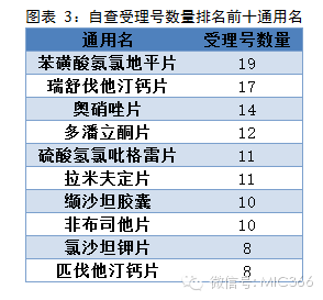 產品通用名方面,共968個通用名涉及本次自查,其中苯磺酸氨氯地平片需自查的受理號數最多,共19個;位列第二的是瑞舒伐他汀鈣片,有17個自查受理號;奧硝唑片以14個受理號排第三。