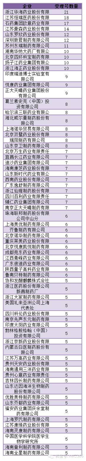 本次自查名單涉及企業共821家,以下為自查品種超過5個的藥企匯總,其中華海藥業需要自查的受理號最多,達到21個。