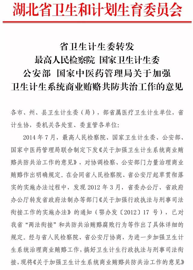 湖北衛計委聯合公安部加強商業賄賂共防共治(附文件)