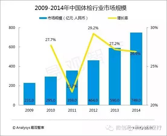 2014年中國(guó)體檢行業(yè)市場(chǎng)規(guī)模達(dá)到749.0億元人民幣,與2013年590.0億元人民幣相比增幅為26.9%。Analysys易觀智庫(kù)分析認(rèn)為,中國(guó)慢性病發(fā)病率快速提升、亞健康問(wèn)題日益凸顯、癌癥發(fā)病率與死亡率持續(xù)攀升等社會(huì)共性問(wèn)題將推動(dòng)人們健康意識(shí)進(jìn)一步提升。確定用戶健康狀況、提早發(fā)現(xiàn)健康隱患等服務(wù)與用戶需求匹配度極高,公立醫(yī)院逐步實(shí)行“醫(yī)檢分離”推動(dòng)公立醫(yī)院體檢專(zhuān)業(yè)化,民營(yíng)專(zhuān)業(yè)體檢機(jī)構(gòu)高速發(fā)展等原因?qū)⒐餐龠M(jìn)中國(guó)體檢行業(yè)健康高速發(fā)展。