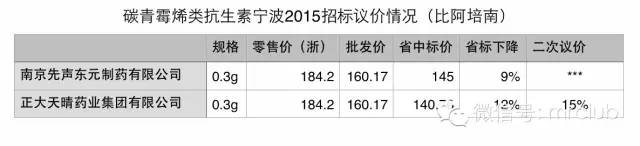 先聲和正大天晴兩個比阿培南在浙江備案的零售價是一樣的,因為比阿培南廠家少,先聲在省標時報了一個謹慎的價格,較批發價來說僅降了9個點,正大天晴則降了12個點,前天寧波二次議價結果出來如何呢?據說在此基礎上又降了15個點,但仍然出局了!