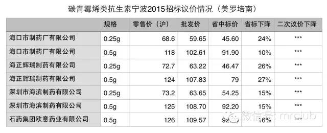 亞胺培南廠家較多,省標確定了7個廠家9個品種,原研藥廠家默沙東吸取了廣州落標的教訓(MSD廣州招標其實除了價格因素,最悲催的是沒考慮到議價組,有感興趣的下文再說),省中標價較批發價下降了15個點!從昨天小編得到的消息來看,二次議價已經中標,以上來推測,累計降幅至少在20個點以上!除了海正輝瑞降得較低外,其他仿制品亞胺培南基本降幅在15個點左右,符合招標方要求,順利入圍!