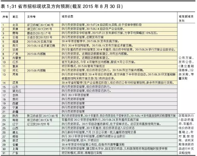 截至8月30日,依據7號文、70號文精神,預計下半年將有21個省市全面啟動藥品采購,有10個省將在現執行/啟動的基藥、非基藥、低價藥項目基礎上,針對直接掛網藥品、談判采購藥品等類別產品進行補充掛網采購。