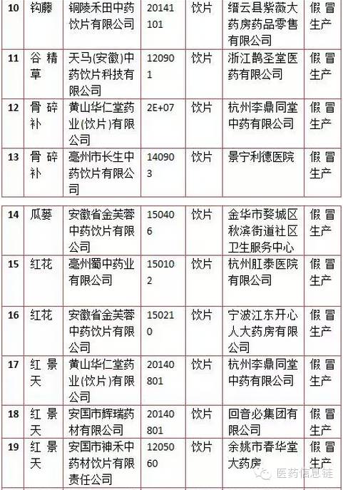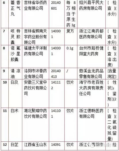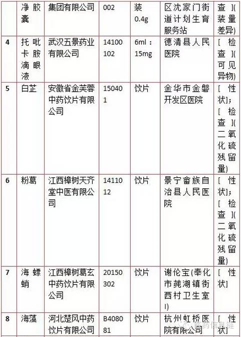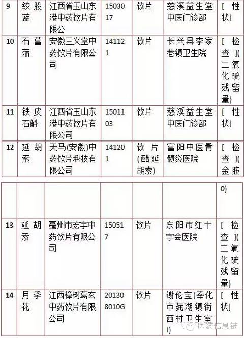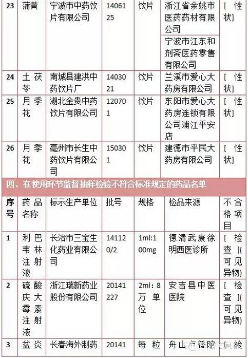 四、在使用環節監督抽樣檢驗不符合標準規定的藥品名單:有14批次,10批次為中藥飲片。
