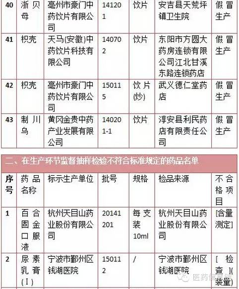 一、抽樣檢驗不符合標準規定且假冒標示生產單位生產的假藥:有44批次,43批次為中藥飲片。