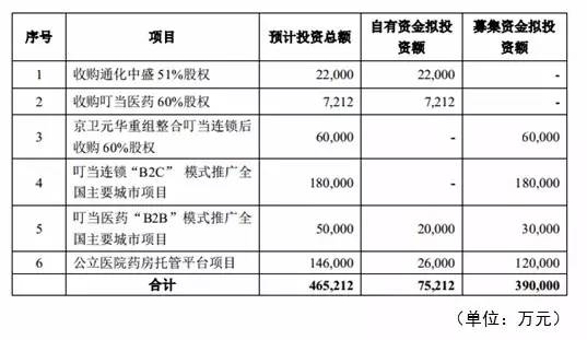 根據(jù)仁和藥業(yè)9月12日發(fā)布的定增預(yù)案顯示,擬以12.52元/股非公開發(fā)行不超過311,501,597股,募集資金的總額不超過39億元,投入收購?fù)ɑ惺?1%股權(quán)、收購叮當(dāng)醫(yī)藥60%股權(quán)、京衛(wèi)元華重組整合叮當(dāng)連鎖后收購60%股權(quán)、叮當(dāng)連鎖“B2C”模式推廣全國主要城市、叮當(dāng)醫(yī)藥“B2B”模式推廣全國主要城市公立醫(yī)院藥房托管平臺等6個項(xiàng)目。