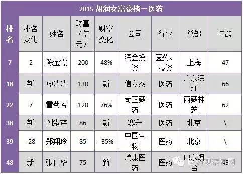 而在白手起家榜單中,女醫藥富豪們共有10位,其中中國占了8個。除了奇正藏藥的雷菊芳和中國生物的鄭翔玲是之前上過榜的,其余八位都是今年新上榜的。