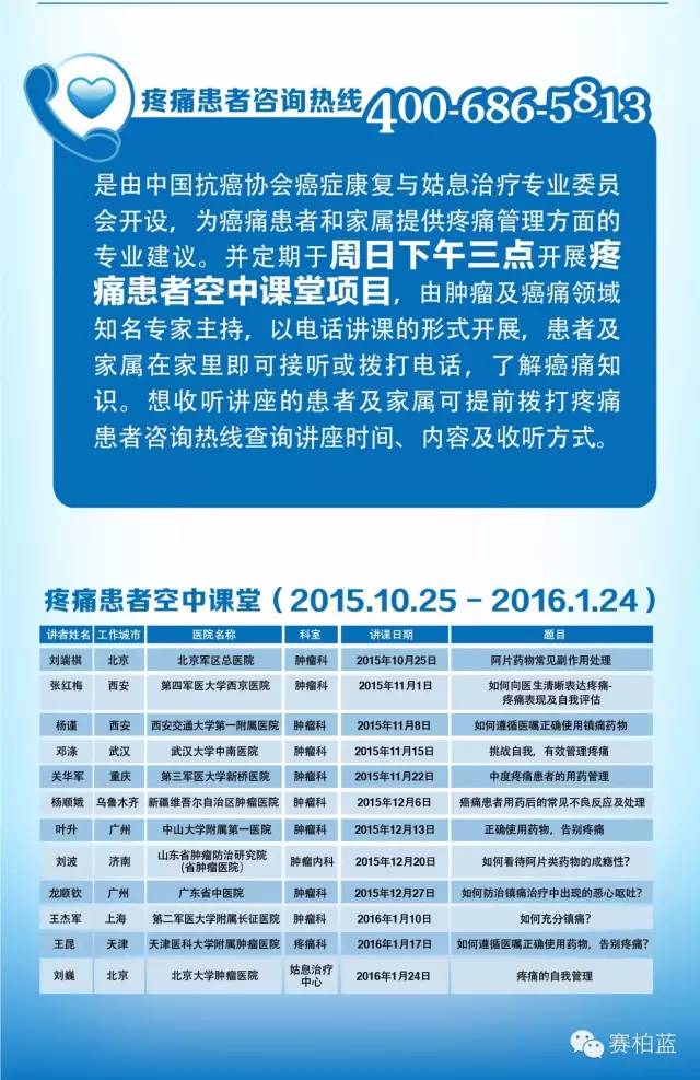 為了方便、有效地幫助廣大的癌痛患者,中國抗癌協會癌癥康復與姑息治療專業委員會率先開設了公益性質的疼痛患者咨詢熱線(400-686-5813)為癌痛患者和家屬提供疼痛管理方面的專業建議。并定期于周日下午三點開展疼痛患者空中課堂項目(課程表詳見附錄),由腫瘤及癌痛領域知名專家主持,以電話講課的形式開展,患者及家屬在家里即可接聽或撥打電話,了解癌痛知識。想收聽講座的患者及家屬可提前撥打疼痛患者咨詢熱線查詢講座時間、內容及收聽方式。
