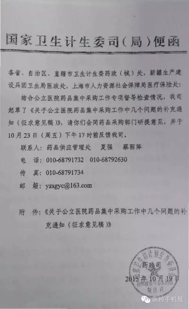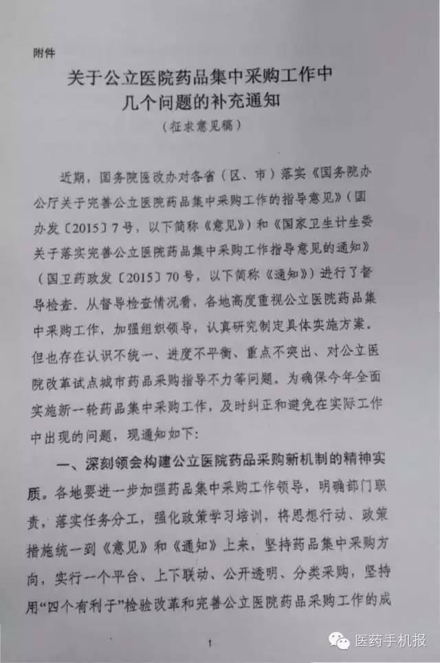 據(jù)爆料,國家衛(wèi)計委藥政司近日向各?。ㄖ陛犑?、自治區(qū))衛(wèi)計委藥政(械)處、新疆生產(chǎn)建設(shè)兵團(tuán)衛(wèi)生局醫(yī)政處及上海市人社局醫(yī)療保險處下發(fā)《關(guān)于公立醫(yī)院藥品集中采購工作中幾個問題的補(bǔ)充通知(征求意見稿)》,并要求上述機(jī)構(gòu)與藥品采購部門研提意見,于10月23日(本周五)下午17:00前反饋意見。