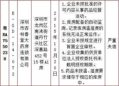 根據(jù)公告,廣東國安堂大藥房有限公司、佛山市民欣醫(yī)藥有限公司、深圳市杏林春堂大藥房連鎖有限公司等3家藥品經(jīng)營企業(yè)嚴(yán)重違反《藥品經(jīng)營質(zhì)量管理規(guī)范》規(guī)定,廣東省藥監(jiān)局依據(jù)《藥品經(jīng)營質(zhì)量管理規(guī)范認(rèn)證管理辦法》第四十五條,依法撤銷其《藥品經(jīng)營質(zhì)量管理規(guī)范認(rèn)證證書》,并根據(jù)《廣東省食品藥品監(jiān)督管理局藥品生產(chǎn)經(jīng)營單位信用分類管理的實(shí)施辦法》(粵食藥監(jiān)法〔2014〕109號)規(guī)定,評定其信用等級為“嚴(yán)重失信”。
