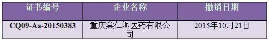 此外,重慶市藥監(jiān)局關(guān)于撤銷重慶棠仁閣醫(yī)藥有限公司藥品經(jīng)營質(zhì)量規(guī)范認(rèn)證證書的公告,重慶棠仁閣醫(yī)藥有限公司嚴(yán)重違反《藥品經(jīng)營質(zhì)量管理規(guī)范》,依據(jù)《藥品經(jīng)營質(zhì)量管理規(guī)范認(rèn)證管理辦法》(國食藥監(jiān)市〔2003〕25號)第四十五條規(guī)定,依法撤銷其《藥品經(jīng)營質(zhì)量管理規(guī)范認(rèn)證證書》。
