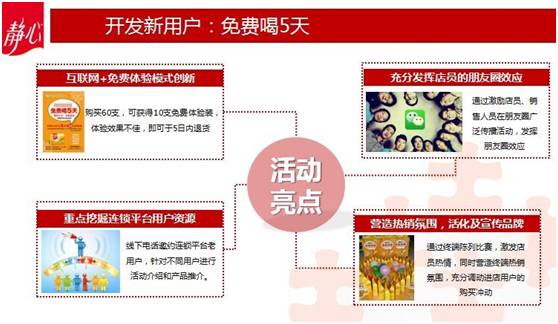 靜心的“免費模式”更是利用互聯網的傳播手段,有效的進行線上線下傳播聯動,快速擴大傳播面,對于終端門店引流起到巨大的推動作用。線上利用微信公眾號做更年調養的品類教育,微信朋友圈做活動告知,建立社區讓店員形成互相PK的氛圍,讓整個“免費喝5天”活動徹底引爆。