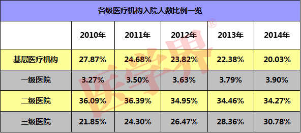 導語:根據2015中國衛生和計劃生育統計年鑒,以診療人次數和入院人數為指標,2010年以來基層醫療機構所提供的醫療服務比例逐年減少,三級醫院則突飛猛進。