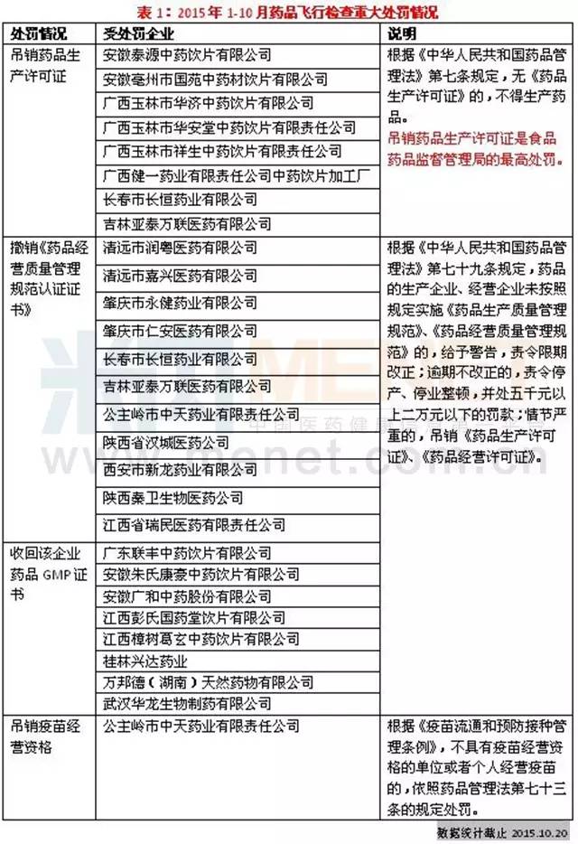 據米內網記者統計的信息,食品藥品監管部門(含各地食品藥品監督管理局)在2015年前10個月共對44家企業進行了飛行檢查,檢查重點在中藥材市場、中藥飲片生產企業、藥品生產企業以及藥品批發企業,期間有一批企業受到了重大處罰。