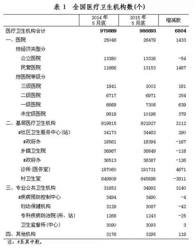 與2014年5月底比較,全國(guó)醫(yī)療衛(wèi)生機(jī)構(gòu)增加6804個(gè),其中:醫(yī)院增加1433個(gè),基層醫(yī)療衛(wèi)生機(jī)構(gòu)增加2112個(gè),專業(yè)公共衛(wèi)生機(jī)構(gòu)增加3140個(gè)。