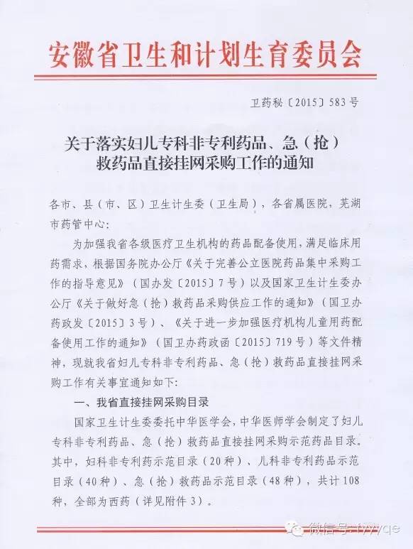 安徽關于落實婦兒專科非專利藥品、急(搶)救藥品直接掛網采購工作的通知