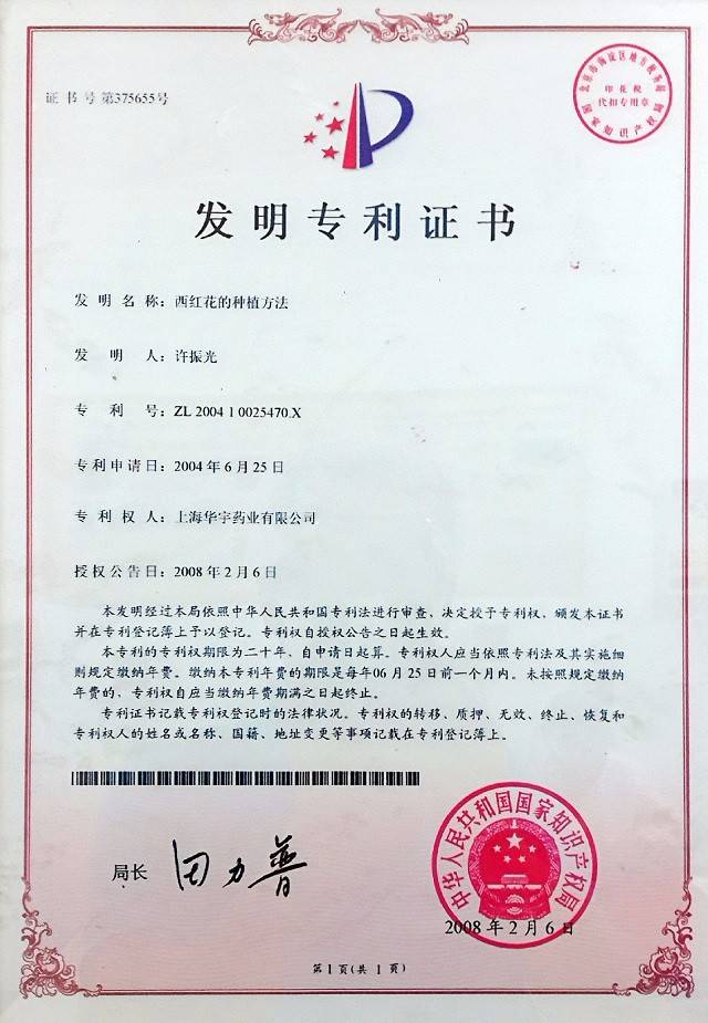 改革開放后,西紅花的藥用功效逐漸受到重視,然而當時西紅花完全依賴進口,國家每年分配給上海市的西紅花配額只有50公斤,遠遠不能滿足市場需求。為了預防將來資源受制于人,影響供應,1979年作為國家科研項目,上海醫藥集團旗下上海市藥材有限公司(以下簡稱“上藥藥材”)從日本引種32噸球莖進行引種試驗和高產生產;1983年上藥藥材啟動“番紅花球莖復壯、增產及推廣研究項目”,并于1985年完成;1987年該項目成果獲得國家科技進步二等獎,填補了國內相關領域的空白;1999年公司響應國家“實施中藥材GAP規范中藥材生產”的號召,將西紅花基地納入中藥材GAP規范管理。滬產西紅花規范化,規模化生產結束了中國西紅花完全依賴進口的歷史;2004年,上藥藥材西紅花種植通過原國家食品藥品監督管理局第一批GAP認證,列為中國的西紅花GAP基地;2008年西紅花種植方法獲得發明專利;2012年工信部《西紅花規范化、規模化和產業化生產基地建設》花落上藥藥材下屬公司華宇藥業。為了更好地推廣西紅花功效,讓更多的人了解西紅花,為了把這個滬上地道藥材讓世界認知,上藥藥材于2015年成立西紅花事業部。