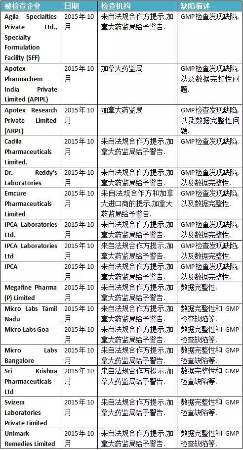 話說2015年在中國制藥行業發展史上,注定是一個不平凡的年頭;同樣,對于印度制藥企業,估計更不是一個平靜的年頭。從目前掌握的公開數據看,2015年度印度制藥企業被國際藥政機構檢查和警告的例子,遠遠大于中國制藥企業。到2015年11月初,印度制藥企業在針對美國FDA、歐盟各藥政機構、加拿大官方檢查中,已經有多家制藥企業未通過檢查,被發現有嚴重缺陷。筆者匯聚和解析這是失敗的案例,期望為意圖開拓國際市場的中國制藥企業提供教訓和值得參考的地方。 本文數據來源主要來自FDA警告信數據庫、歐盟GMP檢查數據庫和加拿大官方檢查數據庫。