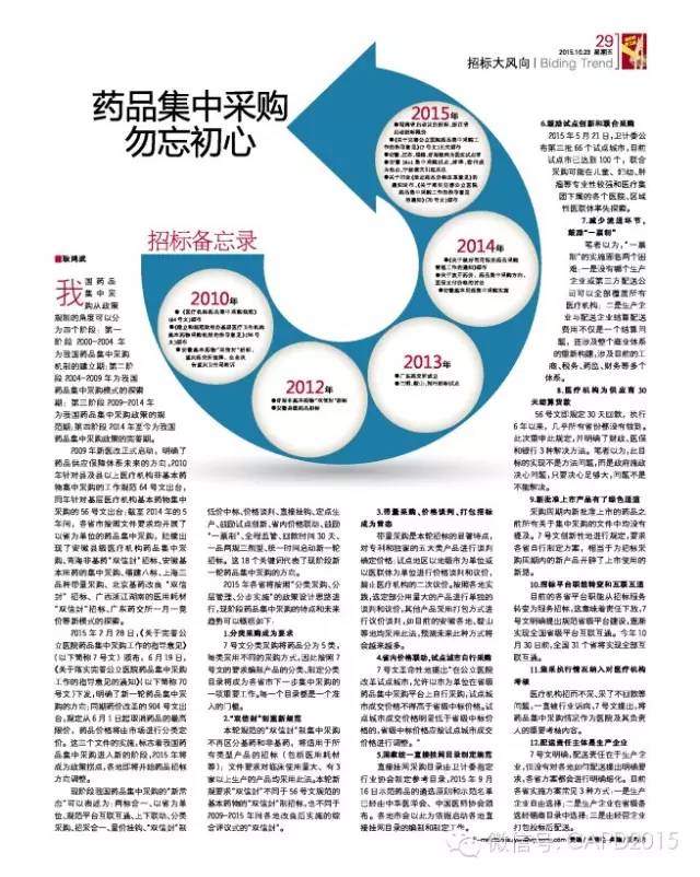 2015年2月28日《關(guān)于完善公立醫(yī)院藥品集中采購(gòu)工作的指導(dǎo)意見》 (以下簡(jiǎn)稱7號(hào)文 )頒布, 6月19日《關(guān)于落實(shí)完善公立醫(yī)院藥品集中采購(gòu)工作的指導(dǎo)意見的通知》(以下簡(jiǎn)稱70號(hào)文 )下發(fā),明確了新一輪藥品集中采購(gòu)的方向;同期藥價(jià)改革的904號(hào)文出臺(tái),規(guī)定從6月1日起取消藥品的最高限價(jià),藥品價(jià)格將由市場(chǎng)進(jìn)行分類定價(jià)。三個(gè)文件的實(shí)施,標(biāo)志著我國(guó)藥品集中采購(gòu)進(jìn)入新的階段, 2015年將成為政策拐點(diǎn),各地即將藥品招標(biāo)方向調(diào)整。