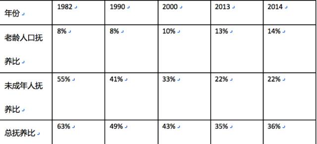 撫養(yǎng)比是非勞動人口與勞動人口的比例,用以表明每100名勞動年齡人口要負(fù)擔(dān)多少名未成年人和老年人。比例越大,居民生活壓力越大。從上圖可以看到,未成年人撫養(yǎng)比從1982年的55%驟降到2014年的22%,這表明了中國目前未成年人數(shù)量不足,未來伴隨著人口老齡化,勞動力數(shù)量將會嚴(yán)重不足,數(shù)量的不足也會傳導(dǎo)到人力成本的提升。為了國家經(jīng)濟的可持續(xù)發(fā)展,保持健康的人口結(jié)果非常關(guān)鍵。因此今年10月29日,十八屆五中全會也做出了“全面放開二胎”的政策決定。