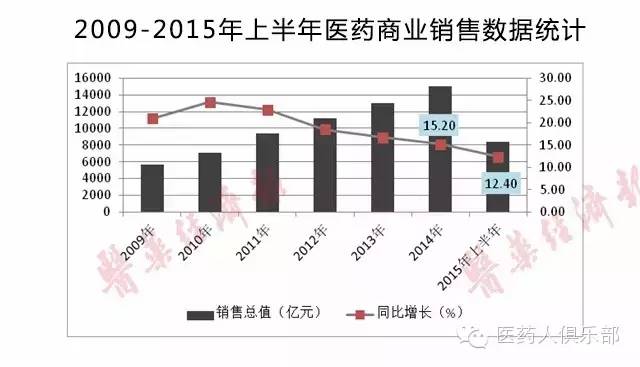 醫(yī)藥商業(yè)年銷售總額自2011年起增速逐年放緩,從該年的24.6%逐步遞減到2014年的15.2%,2015年上半年下降到12.4%。