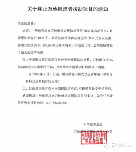 2015年6月29日,中華慈善總會官網上掛出了一條“關于終止萬他維患者援助項目”的通知”。通知中寫道:“現由于捐贈方拜耳醫藥保健公司全球戰略的調整,萬他維自2015年起將逐步退出中國市場。自2015年7月1日起,萬他維患者援助項目不再受理患者申請。”自10月下旬獲悉該消息以來,E藥經理人便展開調查。