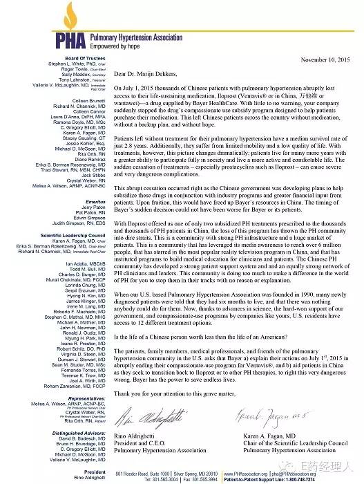 美國肺動脈高壓患者組織肺動脈高壓協會(PHA)主席兼CEO RinoAldrighetti在接受E藥經理人采訪時表示:“對于肺動脈高壓的患者來說,藥物直接關乎他們的生死。”為聲援愛稀客,由PHA寫給拜耳全球董事會主席馬爾金·戴克斯的信中,PHA直接質問戴克斯:“中國人的命就不如美國人的命金貴么?”但到目前為止,PHA還在等待拜耳方面的回復,而在中國,拜耳公司仍未采取任何措施。