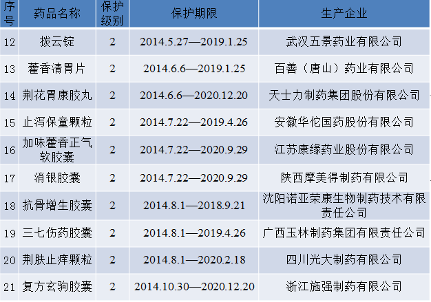 根據(jù)《中藥品種保護(hù)條例》第十六條及有關(guān)規(guī)定,經(jīng)國(guó)家中藥品種保護(hù)審評(píng)委員會(huì)組織的委員審評(píng)、國(guó)家食品藥品監(jiān)督管理總局核準(zhǔn),我們統(tǒng)計(jì)了2015年21家企業(yè)生產(chǎn)的21個(gè)中藥延長(zhǎng)保護(hù)期品種,具體信息見下表。