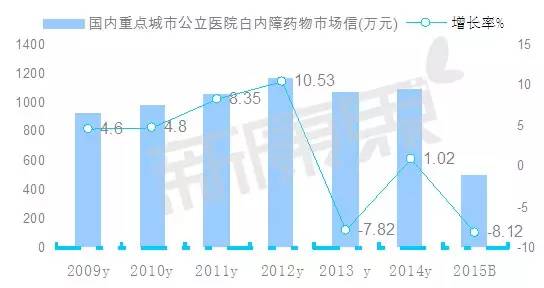 據統計數據顯示,2014年國內重點城市公立醫院常用于白內障的藥物中吡諾克辛、氨碘肽、芐達賴氨酸、谷胱甘肽、法可林、甲狀腺素碘塞羅寧、牛磺酸和酮咯酸氨丁三醇等8個品種有5個呈現出負增長的趨勢,2015年上半年公立醫院治療白內障化藥市場又一次慘遭滑鐵盧,分析表明同比下降了8.12%,其用藥金額僅占眼科藥物市場的0.88%。