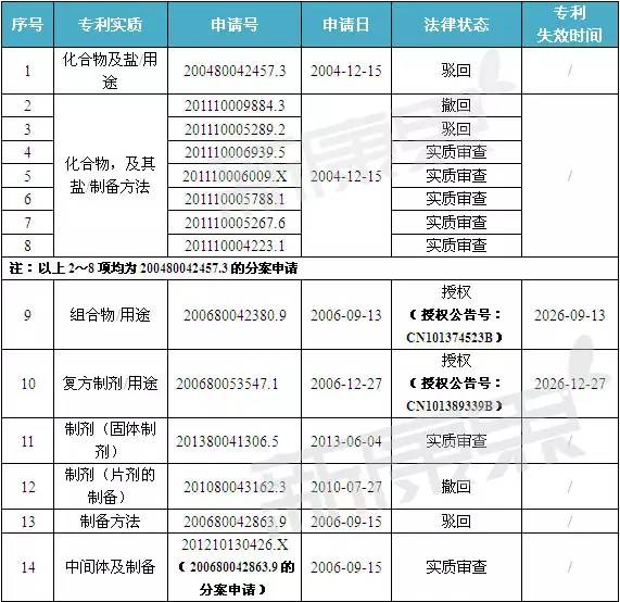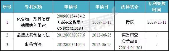 經對表2數據分析可知:武田共在中國申請了19項與曲格列汀相關的專利,目前有3項獲得授權,上述3項授權專利覆蓋了單方制劑,復方制劑(聯合用藥)和晶型的制備。其中,要求保護的琥珀酸曲格列汀A晶型的制備方法的專利CN101573351B將于2027年11月29日到期;要求保護的單方制劑專利CN101374523B將于2026年9月13日到期;要求保護曲格列汀或其鹽與吡格列酮或伏格列波糖聯合用藥的制劑專利CN101389339B則將于2026年12月27日到期。