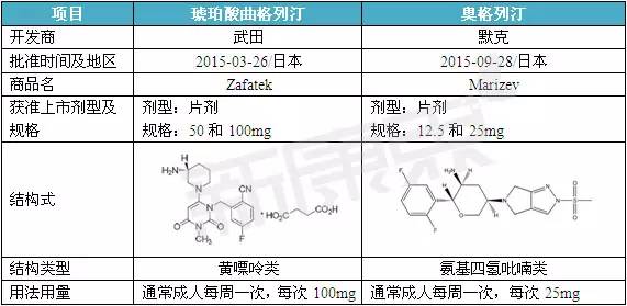 DPP-Ⅳ抑制劑通過抑制腸促胰素的DPP-Ⅳ酶的活性而發揮作用,其通過競爭性結合DPP-Ⅳ活性部位,降低DPP-Ⅳ的催化活性,抑制GLP-1的降解,從而增加血液中GLP-1的濃度。DPP-Ⅳ抑制劑因降糖效果強,且可保護胰島功能,安全性良好而倍受臨床青睞。然而,最近發展起來的長效口服DPP-Ⅳ抑制劑,由于每周僅需給藥1次而提高了患者的便利性和依從性,其臨床價值和臨床地位或將有望提升。盡管口服降糖藥林林總總,但長效口服DPP-Ⅳ抑制劑將以其獨特的優勢有望在競爭激烈的口服降糖藥市場中突飛猛進。迄今為止,已有兩個長效口服DPP-Ⅳ抑制劑應用于臨床,這兩個藥物分別是于2015年3月26日和2015年9月28日獲日本醫藥品與醫療器械綜管理局(PMDA)批準的琥珀酸曲格列?。═relagliptin Succinate,SYR-472)和奧格列?。?Omarigliptin,MK-3102)(有關這兩個產品的基本信息詳見表1)。盡管上述這兩個產品均尚未在歐美等主流國家或地區上市,但曲格列汀和奧格列汀已在日本開展一場PK大賽,孰將于這場PK大賽中奪冠我們拭目以待。