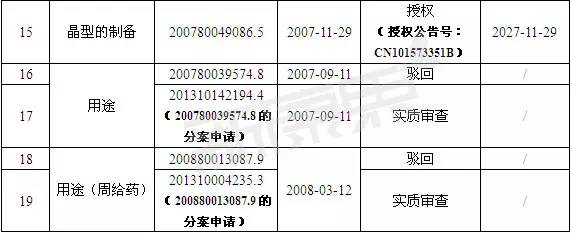 值得一提的是,首篇包含曲格列汀化合物在內的通式化合物專利200480042457.3在中國已被駁回。在此基礎上,武田公司于2011年先后共申請了7項分案申請,目前有6項處于實質審查階段。其中,201110005788.1要求保護的是曲格列汀的琥珀酸鹽-該鹽正是上市活性成分。該專利若能獲得授權,其專利到期時間為2024年12月15日。需特別說明的是,琥珀酸曲格列汀的A晶型在中國并未獲得保護,專利CN101573351B僅保護A晶型的制備方法。此外,用途專利201310142194.4和201310004235.3均處于實審階段。