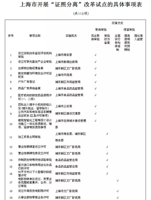 開展“證照分離”改革試點(diǎn),是推進(jìn)簡(jiǎn)政放權(quán)、放管結(jié)合、優(yōu)化服務(wù)的重要舉措,主要解決“先照后證”后市場(chǎng)主體辦證難的問題。通過采取改革審批方式和加強(qiáng)綜合監(jiān)管,進(jìn)一步完善市場(chǎng)準(zhǔn)入,使企業(yè)辦證更加便捷高效。對(duì)企業(yè)能夠自主決策的經(jīng)營(yíng)活動(dòng),取消行政審批,或改為備案管理;對(duì)暫時(shí)不能取消審批的行政許可,簡(jiǎn)化審批方式,實(shí)行告知承諾制;對(duì)不適合采取告知承諾制的行政許可事項(xiàng),簡(jiǎn)化辦事流程,公開辦事程序,提高審批的透明度和可預(yù)期性;對(duì)涉及國(guó)家安全、公共安全等特定領(lǐng)域,繼續(xù)強(qiáng)化市場(chǎng)準(zhǔn)入管理,加強(qiáng)風(fēng)險(xiǎn)防范。進(jìn)一步探索加強(qiáng)事中事后監(jiān)管的有效方式和措施,建立綜合監(jiān)管體系,切實(shí)增強(qiáng)監(jiān)管合力,提升監(jiān)管效能。按照易操作、可管理的要求,從與企業(yè)經(jīng)營(yíng)活動(dòng)密切相關(guān)的行政許可事項(xiàng)中,選擇審批頻次比較高、改革后效果比較明顯的116項(xiàng)行政許可事項(xiàng)(詳見附表),先行開展改革試驗(yàn)。根據(jù)行政許可事項(xiàng)的不同情況,分類推進(jìn),深入試點(diǎn)。(一) 取消審批。對(duì)市場(chǎng)競(jìng)爭(zhēng)機(jī)制能夠有效調(diào)節(jié),行業(yè)組織或中介機(jī)構(gòu)能夠有效實(shí)現(xiàn)行業(yè)自律管理的事項(xiàng),取消行政審批,實(shí)行行業(yè)自律管理,允許企業(yè)直接開展相關(guān)經(jīng)營(yíng)活動(dòng)。包括設(shè)立可錄光盤生產(chǎn)企業(yè)審批等10項(xiàng)行政許可事項(xiàng)。(二) 取消審批,改為備案。政府為及時(shí)、準(zhǔn)確地獲得相關(guān)信息,更好地開展行業(yè)引導(dǎo)、制定產(chǎn)業(yè)政策和維護(hù)公共利益,對(duì)行政許可事項(xiàng)實(shí)行備案管理。根據(jù)規(guī)定的備案條件,企業(yè)將相關(guān)材料報(bào)送政府有關(guān)部門后,即可開展相關(guān)經(jīng)營(yíng)活動(dòng);發(fā)現(xiàn)企業(yè)有違法違規(guī)行為,通過加強(qiáng)事中事后監(jiān)管,予以糾正或處罰。政府部門不對(duì)備案材料進(jìn)行核準(zhǔn)或許可。包括加工貿(mào)易合同審批等6項(xiàng)行政許可事項(xiàng)。(三) 簡(jiǎn)化審批,實(shí)行告知承諾制。對(duì)暫時(shí)不能取消審批,但通過事中事后監(jiān)管能夠糾正不符合審批條件的行為且不會(huì)產(chǎn)生嚴(yán)重后果的行政許可事項(xiàng),實(shí)行告知承諾制。對(duì)實(shí)行告知承諾的行政許可事項(xiàng),由行政審批機(jī)關(guān)制作告知承諾書,并向申請(qǐng)人提供示范文本,一次性告知企業(yè)審批條件和需要提交的材料,企業(yè)承諾符合審批條件并提交有關(guān)材料,即可當(dāng)場(chǎng)辦理相關(guān)行政許可事項(xiàng)。申請(qǐng)人達(dá)到法定許可條件后,方可從事被許可行為。包括機(jī)動(dòng)車維修經(jīng)營(yíng)許可等26項(xiàng)行政許可事項(xiàng)。(四) 提高審批的透明度和可預(yù)期性。對(duì)暫時(shí)不能取消審批,也不適合采取告知承諾制的行政許可事項(xiàng),簡(jiǎn)化辦事流程,公開辦事程序,推進(jìn)標(biāo)準(zhǔn)化管理和網(wǎng)上辦理,明確審批標(biāo)準(zhǔn)和辦理時(shí)限,以最大程度減少審批的自由裁量權(quán),實(shí)現(xiàn)辦理過程公開透明、辦理結(jié)果有明確預(yù)期。包括會(huì)計(jì)師事務(wù)所及其分支機(jī)構(gòu)設(shè)立審批等41項(xiàng)行政許可事項(xiàng)。(五) 對(duì)涉及公共安全等特定活動(dòng),加強(qiáng)市場(chǎng)準(zhǔn)入管理。對(duì)直接涉及國(guó)家安全、公共安全、生態(tài)環(huán)境保護(hù)以及直接關(guān)系人身健康、生命財(cái)產(chǎn)安全等特定活動(dòng)的行政許可事項(xiàng),按照國(guó)際通行規(guī)則,加強(qiáng)風(fēng)險(xiǎn)控制,強(qiáng)化市場(chǎng)準(zhǔn)入管理。包括設(shè)立經(jīng)營(yíng)性互聯(lián)網(wǎng)文化單位審批等33項(xiàng)行政許可事項(xiàng)。(一) 以信息互聯(lián)共享為基礎(chǔ),實(shí)施協(xié)同監(jiān)管。厘清政府有關(guān)部門市場(chǎng)監(jiān)管職責(zé),建立登記注冊(cè)、行政審批、行業(yè)主管相互銜接的市場(chǎng)監(jiān)管機(jī)制,推進(jìn)實(shí)施“雙告知”、“雙隨機(jī)”抽查等制度。建立市場(chǎng)監(jiān)管信息互聯(lián)共享機(jī)制,推進(jìn)信息交流和資源共享,實(shí)現(xiàn)工商部門、審批部門、行業(yè)主管部門以及其他部門之間的信息實(shí)時(shí)傳遞和無障礙交換。加強(qiáng)跨部門聯(lián)動(dòng)響應(yīng),形成“一處違法、處處受限”的聯(lián)合懲戒機(jī)制。推進(jìn)統(tǒng)一市場(chǎng)監(jiān)管和綜合執(zhí)法模式,整合監(jiān)管部門,減少監(jiān)管層級(jí),提高監(jiān)管效能。(二) 以誠(chéng)信管理為手段,實(shí)施分類監(jiān)管。加快公共信用信息平臺(tái)的建設(shè)和應(yīng)用,建立行政審批誠(chéng)信檔案制度,依據(jù)監(jiān)管對(duì)象的日常經(jīng)營(yíng)活動(dòng)、信用評(píng)價(jià)信息等誠(chéng)信情況,將監(jiān)管對(duì)象分為不同類別,建立相應(yīng)的激勵(lì)機(jī)制、預(