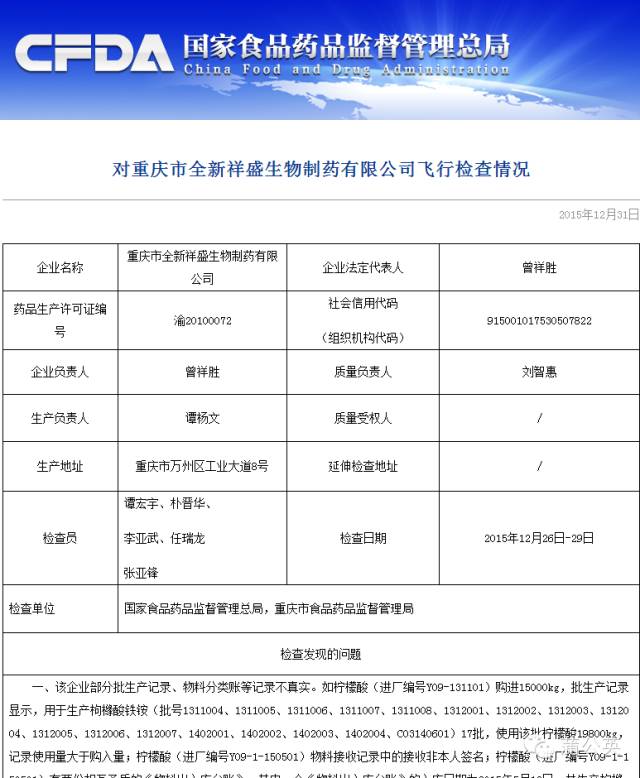 揭露鉻超標事件真相:對重慶市全新祥盛生物制藥飛行檢查情況