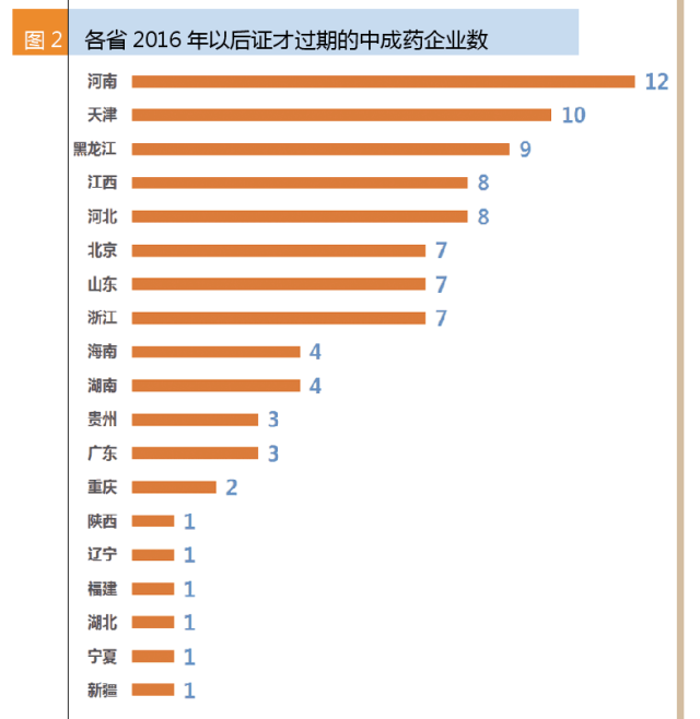 2016~2019年才過期的90家中成藥生產企業中,河南的企業最多,共12家;其次是天津,共10家;第三是黑龍江。一些中藥企業較多的省份都是2015年到期,如吉林、廣西和四川。即使是有著中成藥傳統的廣東,2016年后才過期的只有3家。