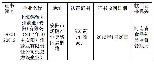 上海錦帝九州藥業(yè)(安陽)有限公司(2014年10日由安陽九州藥業(yè)有限責(zé)任公司變更為該企業(yè))嚴重違反《藥品生產(chǎn)質(zhì)量管理規(guī)范(2010年修訂)》規(guī)定,依據(jù)《藥品生產(chǎn)質(zhì)量管理規(guī)范認證管理辦法》第三十三條規(guī)定,河南省食品藥品監(jiān)督管理局依法收回其紅霉素原料藥的《藥品GMP證書》,現(xiàn)予以公告。