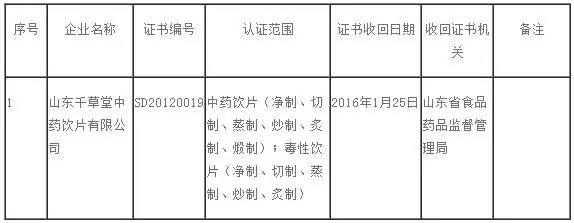 1月25日,山東省藥監(jiān)局發(fā)布《收回山東千草堂中藥飲片有限公司GMP證書的公告》(2016年第1號),山東千草堂中藥飲片有限公司嚴重違反《藥品生產(chǎn)質(zhì)量管理規(guī)范》規(guī)定,依據(jù)《藥品生產(chǎn)質(zhì)量管理規(guī)范認證管理辦法》第三十三條規(guī)定,依法收回其《藥品GMP證書》。