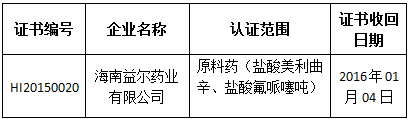 海南益爾藥業(yè)有限公司嚴重違反《藥品生產(chǎn)質(zhì)量管理規(guī)范》規(guī)定,依據(jù)《藥品生產(chǎn)質(zhì)量管理規(guī)范認證管理辦法》第三十三條規(guī)定,海南省藥監(jiān)局局依法收回其《藥品GMP證書》。