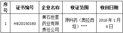 黃石世星藥業(yè)有限責(zé)任公司嚴重違反《藥品生產(chǎn)質(zhì)量管理規(guī)范(2010年修訂)》規(guī)定,依據(jù)《藥品生產(chǎn)質(zhì)量管理規(guī)范認證管理辦法》第三十三條規(guī)定,湖北省藥監(jiān)局依法收回該企業(yè)奧拉西坦原料藥的《藥品GMP證書》。