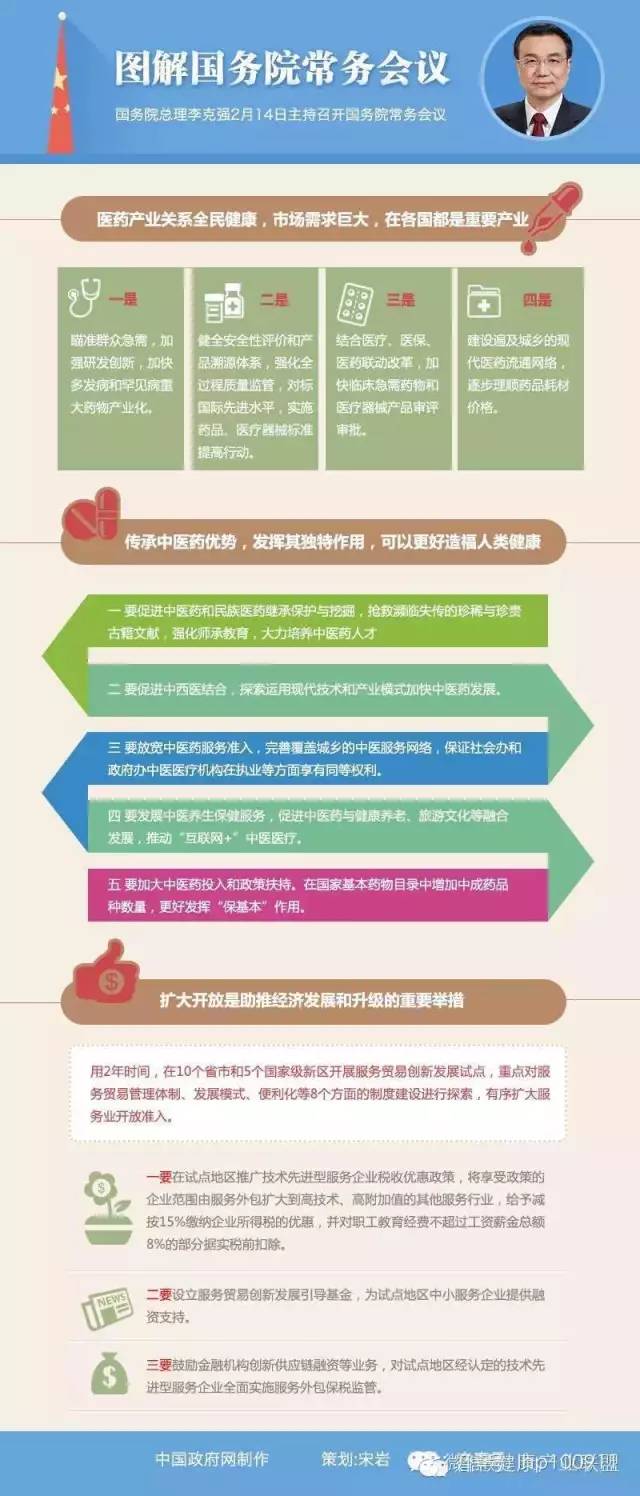 當天會議的一項議題,是確定進一步促進中醫藥發展措施,發揮傳統醫學優勢造福人民。李克強說,近年來,中醫藥產業持續快速增長,要繼續出臺一些“打到點子上”的硬措施。