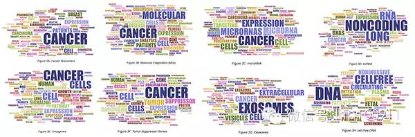 出版物的數量增長及其相對復合年增長率是定量評估癌癥生物標志物發展的良好指標,但僅憑這些指標不能判斷癌癥生物標志物的發展,例如給定的生物標志物適合哪種類型的癌癥或利用哪些技術平臺來審核這些標志物,這些都是需要考慮的重要問題,因此本報告還試圖追蹤各類癌癥生物標志物的市場演變。報告在出版物標題中捕獲生物標志物并以文字云的形式展現出來,從而對癌癥生物標志物進行定性分析,出版物標題中詞的相對大小與該詞在出版物數據庫中的豐度成正比,結果如圖3所示。
