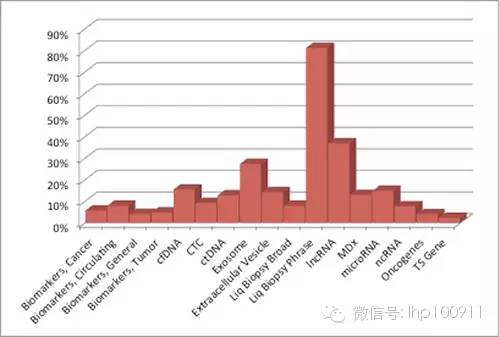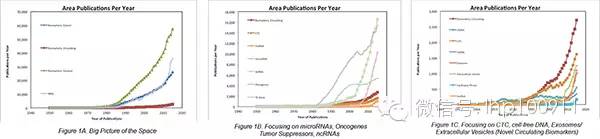圖1為根據出版率繪制的各類癌癥生物標志物的生長情況。盡管曲線的變化趨勢不一,但多個新興的癌癥生物標志物都呈增長趨勢。根據出版物數據庫四年復合年增長率的分析,長鏈非編碼RNAs(LncRNAs)以及外泌體是增長速度最快的生物標志物類型。由曲線的趨勢可得知生物標志物在不斷地發展,從基礎的研究到數據驗證并最終到臨床。