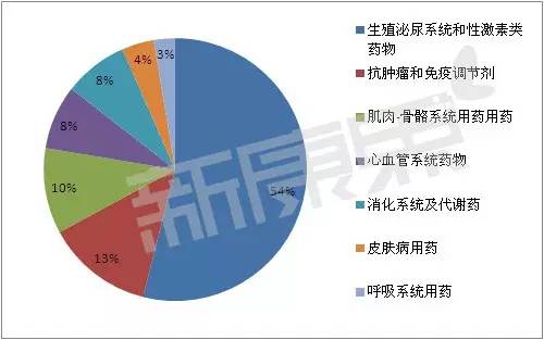 從治療領域來看,超過一半(41個)的新藥屬于生殖泌尿系統和性激素類藥物,此外,抗腫瘤和免疫調節劑(10個)、肌肉-骨骼系統用藥(8個)、心血管系統藥物(6個)和消化系統及代謝藥(6個)數量也較多。