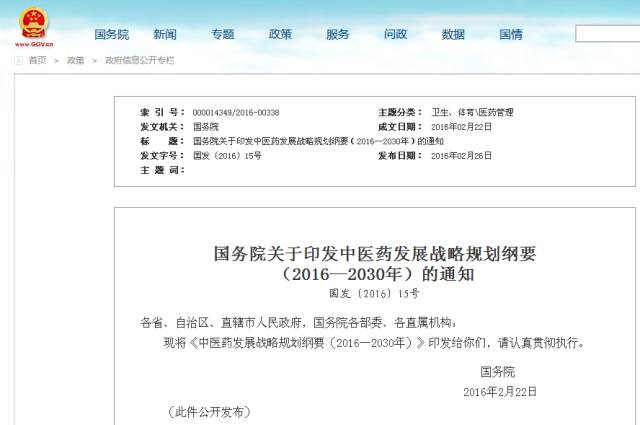 國務院正式發(fā)布《中醫(yī)藥發(fā)展戰(zhàn)略規(guī)劃綱要(2016—2030年)》